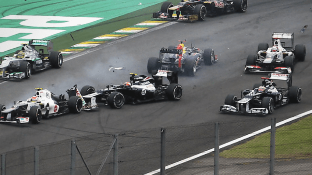 You never want to be facing the wrong direction on the racing track, with the entire field of cars coming straight at you. This was the situation Sebastian Vettel found himself in as he watched his championship hopes fade away. Coming into the last race of the season, the title fight was between Fernando Alonso and Vettel. Both vying to add a 3rd title to their name. Alonso was 13 points behind Vettel. The race started damp with Vettel and Alonso starting P4 and P7, respectively. After the first lap chaos, Vettel was in P22, while Alonso was comfortably in P5 and showing no intentions of slowing down. Alonso needed to be on the podium to have any chance of winning the championship. As rain starts to fall, strategy calls to change tyres, again, became crucial in delivering a good race. Good strategy calls from Jenson Button saw him winning the race with Alonso finishing P2. But that proved not quite enough for the 2-time world champion, as reigning champion Vettel crossed the line in P6, clinching his third title, just 3 points ahead of Alonso.