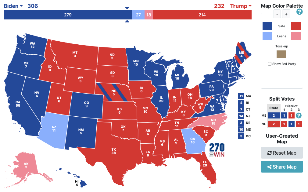 To me, the states in sky blue and pink were really toss ups, but I characterised them based on reading and understanding the demographic shifts in those states over the years. Here are the “results” (it really isn’t a result because States have until December to publish their official results).