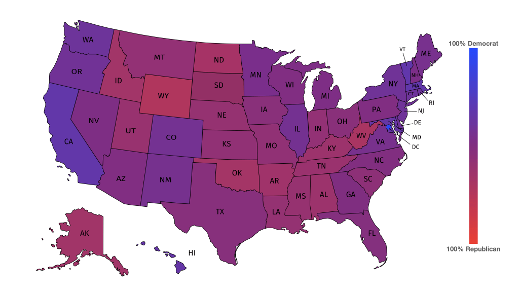 The presence of bright red and blue portrays a picture of polarisation in the nation. It gives a sense of Left vs Right. This is a result of politics and the need to choose 1 of 2 (real) choices. But really, States are not Red or Blue but a combination of representation of Republicans and Democrats. This made me ask the question: What happens if we consider the vote share in each state and use a range of colours to visually represent how States voted for President?