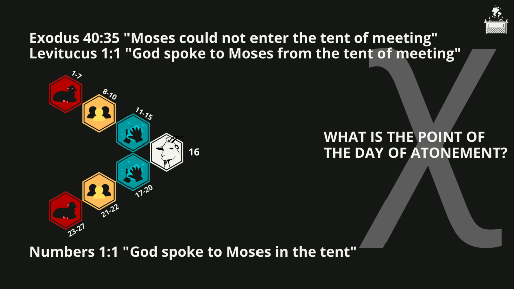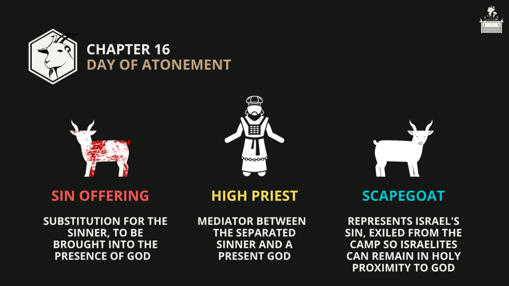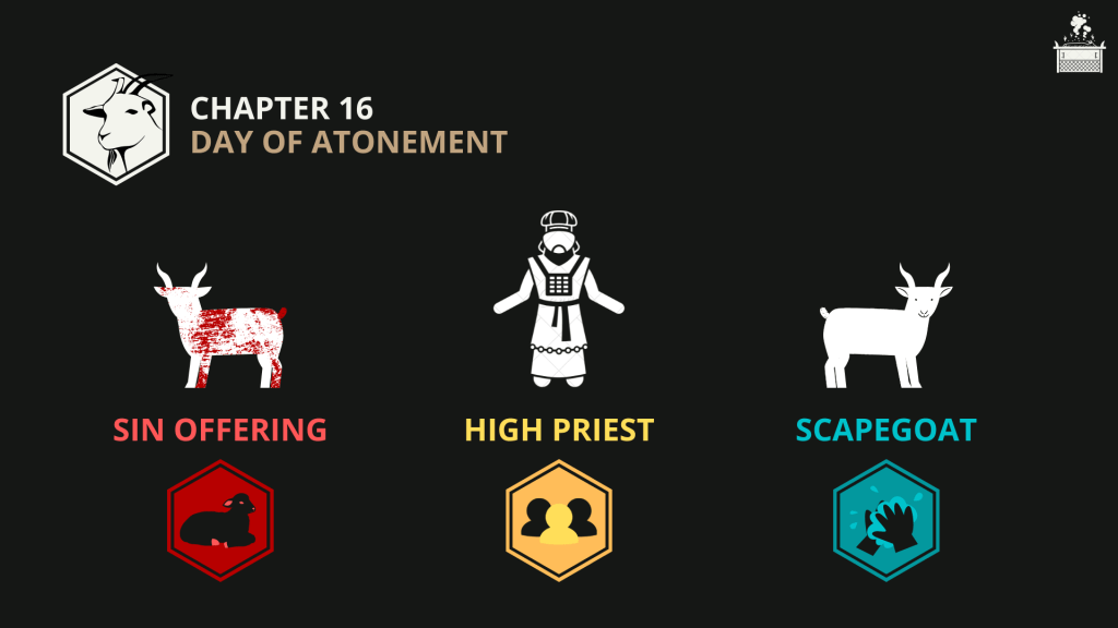 Notice how all three elements of Leviticus can be found in just these 4 verses describing the Day of Atonement. The sin offering represents the rituals, the high priest, represents the priesthood, and lastly, the scapegoat represents the atoning purity.