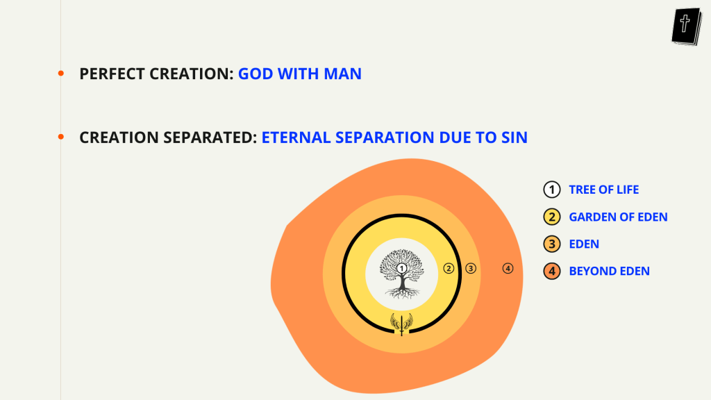 All things were made perfect in the beginning in Genesis 1-2. We are told that God made all things, and at the heart of all of His creation is a place called the Garden of Eden. This was a garden planted by God in a place called Eden, where at the centre of this garden, is the Tree of Life. Adam and Eve were told that they were permitted to eat from this tree. And as long as Adam and Eve ate from this tree, they are never far from the presence of God. (Analogy of safe zone when playing catching)
