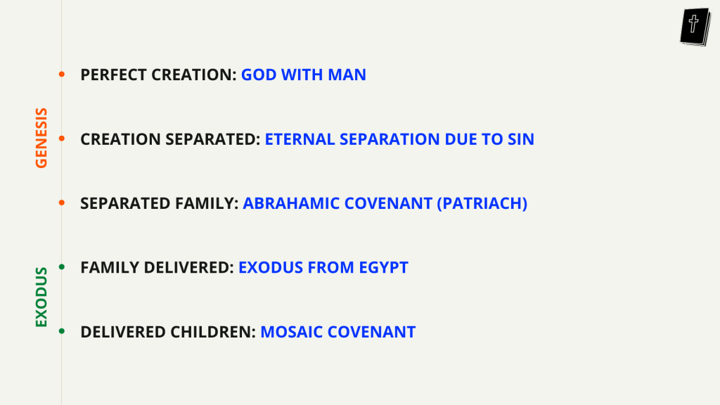 - Genesis and Exodus describe for us the Holiness problem – while God is here on earth with us, man still cannot come close to God, as they originally were in the Garden of Eden.