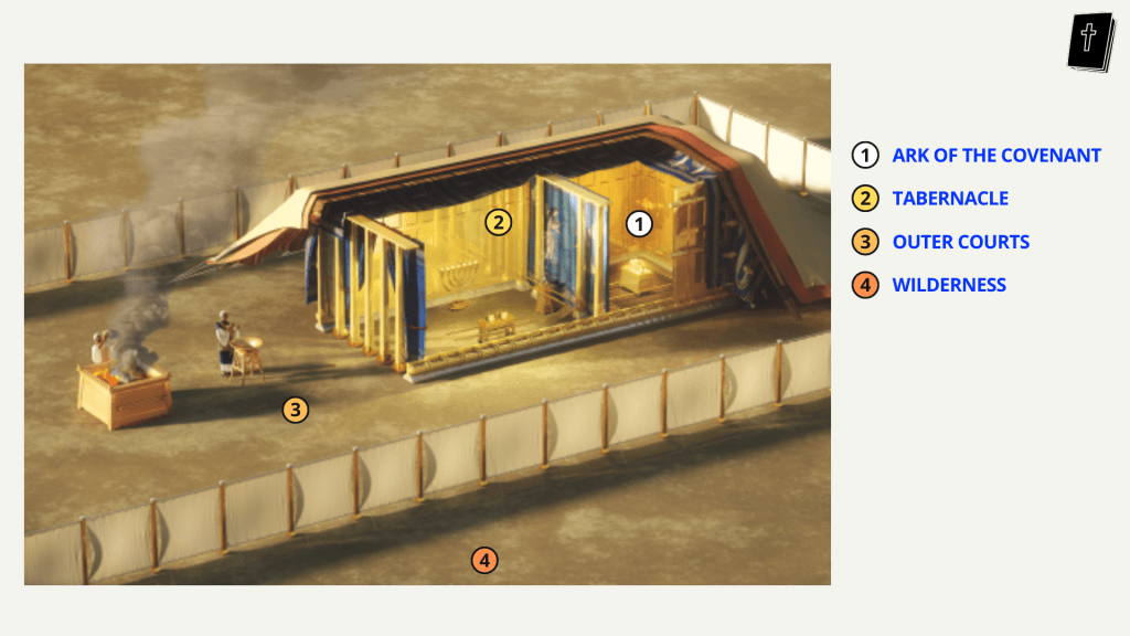 At end of the Scroll of Exodus, God instructed Moses to build a Tabernacle, so that God can dwell among His people. BUT! Israel is still sinful, so God still had to be separated from Israel, His presence residing in the Ark of the Covenant, was kept away from the entire Israelite camp in the Holy of Holies of the Tabernacle.