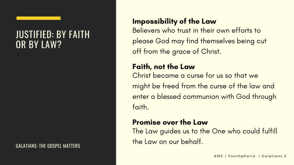 Justification through the law requires perfect obedience. But since no one can completely comply to the entire Book of the laws, everyone is cursed. The Law does not provide a means of justification or salvation. But Christ redeemed us from the curse by becoming a curse for us on the cross. Paul reveals the glorious truth of redemption through Christ. He explains that Jesus took upon Himself the curse of the law, becoming a curse for us.