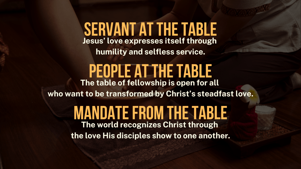 (Opening Prayer) Heavenly Father, we gather as one body, united in remembrance of Your Son’s steadfast love and heart of servitude. Tonight, as we reflect on the events of Maundy Thursday, may Your Spirit dwell among us, opening our hearts to receive Your Word and calling us to follow the example of Christ in love and service. Speak through me, Lord, and may everything we do here tonight glorify Your holy name. In Jesus’ name, we pray. Amen.